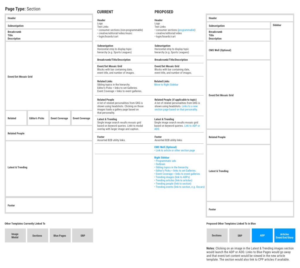Getty Images was in the midst of consolidating its consumer offerings with its pro offerings, and it became increasingly evident that we needed a strategy for balancing these different user needs. To create some clarity for the team, I mapped out how each main page template could evolve to include content for each of these audiences in a balanced way.